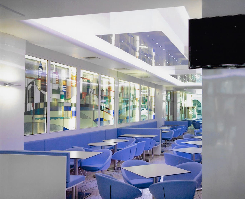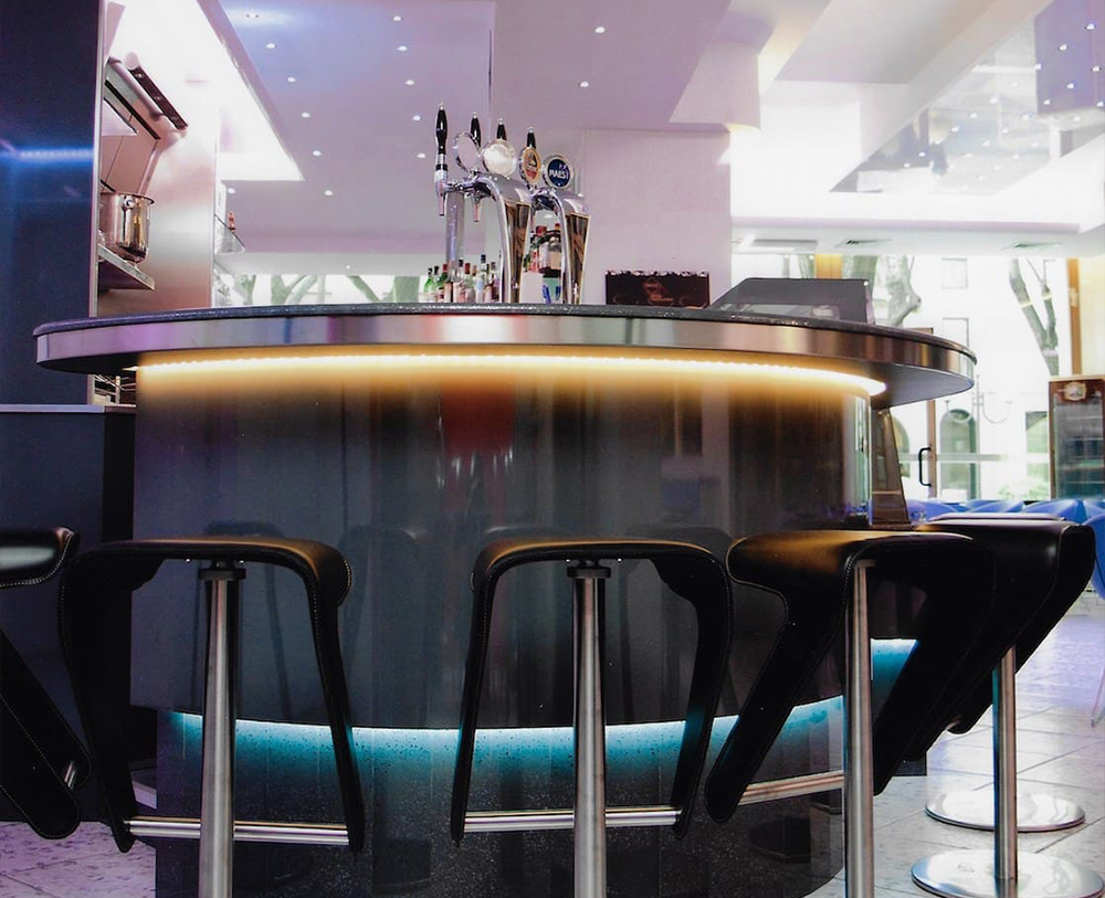 Il nostro progetto di arredo del bar “Da Marino” a Monfalcone, si ispira all’essenza marina e all’innovazione moderna. Utilizzando acciaio e vetro, abbiamo creato un ambiente elegante e luminoso, amplificato dall’uso delle luci a LED. Il nostro arredo moderno, con sedie bar e sgabelli per bancone in un vivace colore blu, aggiunge una nota di freschezza e vitalità a questo spazio unico.